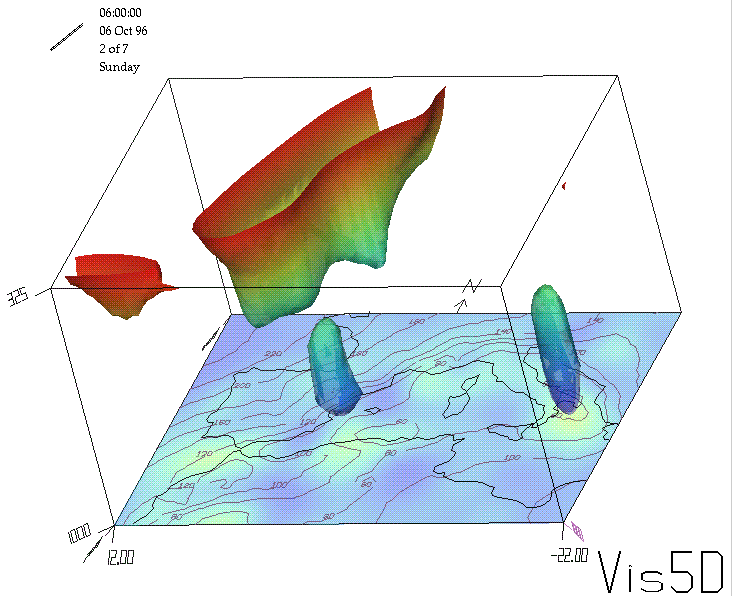 | An example of an upper level PV anomaly and its effect on surface development. In this case a low level PV anomaly is also generated, probably via latent heat release processes (see latent heat release unit of study). After some time both anomalies become coupled, which is usually a sign of strong or explosive cyclogenesis. The surface represented corresponds to the 6.41x10exp(-5) s-1 geostrophic vorticity constant surface. Images in animation by Catalina Estarellas, Illes Balears Meteorological Center, INM. |