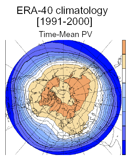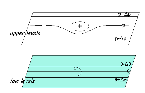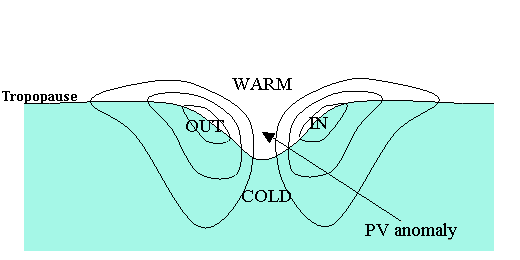 | [CM of symmetric PV anomaly]: The wind is usually strong around the PV anomaly. Partly because of thermal wind balance must be satisfied, and thermal gradients are strong between tropospheric and stratospheric air. |