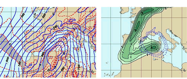 | An example of an upper level PV anomaly situated over a strong baroclinic zone at low levels. [Left]: Surface pressure plus temperature fields at 925 hpa level, 21-12-1979, 00 UTC. [Right] Potential vorticity field at 250 hpa. We can see west of Sardinia Island, a very strong baroclinic zone at 925 hpa, and in the same position, but at upper levels a 9 PVU potential vorticity anomaly. That matches very much Hoskins conceptual model, an accounts for an important part of the deepening of the cyclone. |