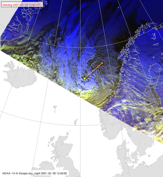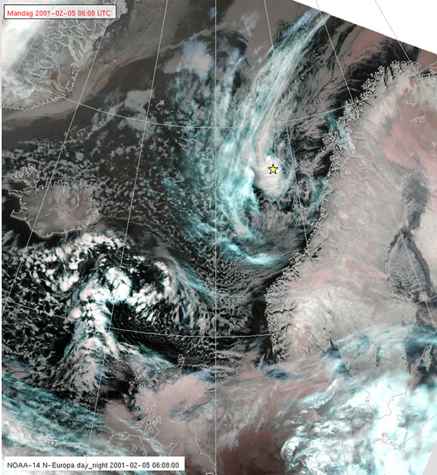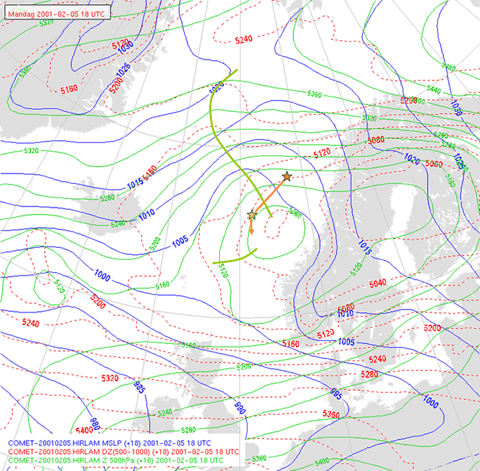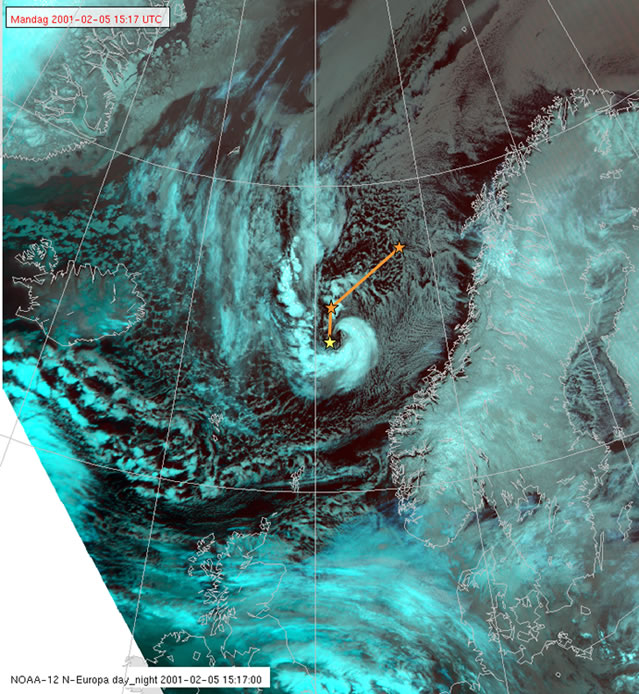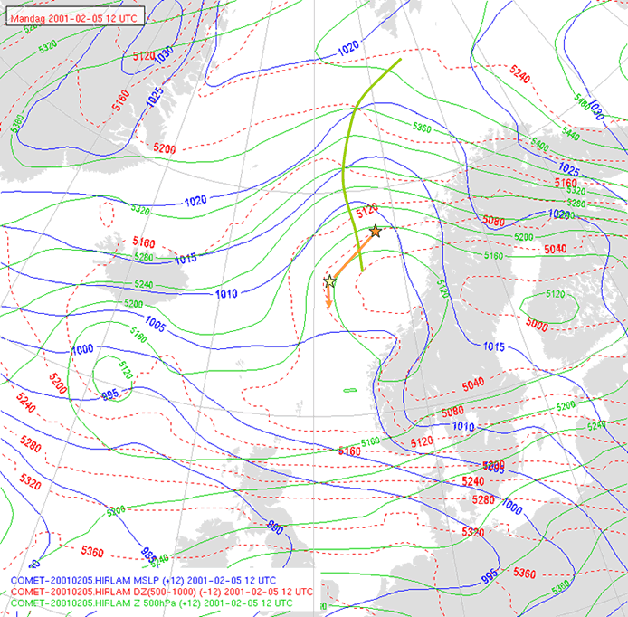 At 1240, the surface low position is now at approximately 66N, 01,40E. It has travelled around 170 nm on a bearing approximately 240 degrees, with a speed of about 28 kt!