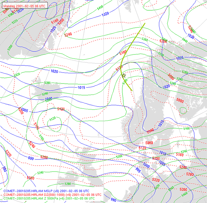 The Hirlam model shows that the low position at 06 UTC is located close to the axis of the 500hPa trough, and is consistent with the general MSLP field. It lies ahead of the cold air which is approaching from the East, but is well correlated with the PVA area shown by the Met Office model.