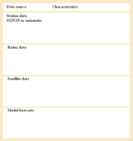 Complete the following table by dragging the text tags describing data characteristics into the appropriate box of the right hand column of the table. As you will see from this exercise, the matching of forecasts and observations for verification presents challenges because of the large differences in characteristics.
