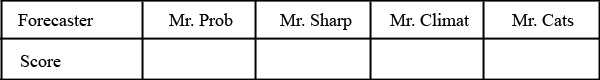 "Mr. Prob", "Mr. Sharp", "Mr. Climat", and "Mr. Cats." Mr. Prob believes he can distinguish